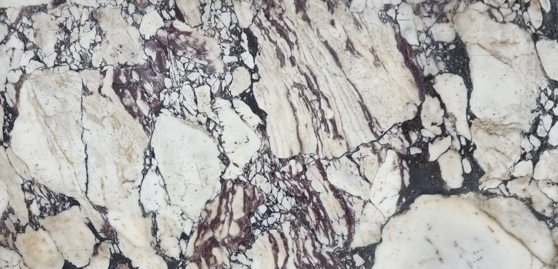 Calacatta Viola marble is characterized by its deep and vibrant color palette, in which purple veins blend harmoniously with beige on a bright, white background. The result is a striking and opulent marble that exudes a sense of luxury and sophistication. The colors are intense and vibrant, making each slab unique and able to make a powerful visual statement in any interior.